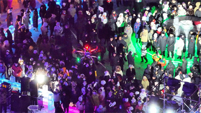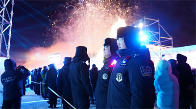 開園儀式上,近萬名游客在現(xiàn)場觀賞了煙花秀,一抹抹“藏藍”卻背對舞臺堅守崗位。為確保不發(fā)生人流聚集和逆向沖擊等突發(fā)事件,滿洲里市公安局提前謀劃、科學(xué)布警,針對園區(qū)占地面積較大、娛樂項目較多等特點,以園區(qū)“冰廊道”項目為中軸,細致劃分出東西兩個區(qū)域的巡邏路線,安排警力“掛圖”開展巡邏工作。當發(fā)現(xiàn)人員擁堵等情況時,民警立即通過無人機喊話與巡邏警力相配合,進行現(xiàn)場人員引導(dǎo)分流,確保園區(qū)安全有序。