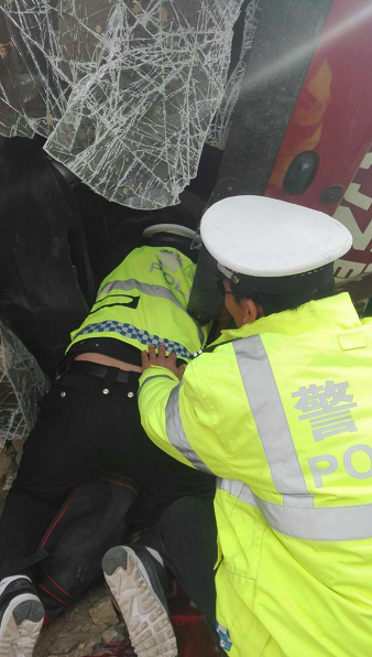 到達(dá)現(xiàn)場(chǎng),車(chē)輛駕駛室已嚴(yán)重變形車(chē)門(mén)無(wú)法打開(kāi),車(chē)上人員被困車(chē)內(nèi),且車(chē)上的燃?xì)膺€在“哧哧”地向外泄漏。為防止泄漏的天燃?xì)庥龌鸢l(fā)生爆炸,韓立一副中隊(duì)長(zhǎng)對(duì)現(xiàn)場(chǎng)施救工作進(jìn)行了仔細(xì)研究并明確分工,一組民警負(fù)責(zé)對(duì)事故現(xiàn)場(chǎng)道路進(jìn)行封閉,疏散圍觀人員提醒群眾嚴(yán)禁使用明火。另一組民警負(fù)責(zé)事故現(xiàn)場(chǎng)勘查取證和救助傷者。為盡快救出被困傷者,民警決定撬開(kāi)車(chē)輛前擋風(fēng)玻璃將被困人員救出,此時(shí)的車(chē)輛擋風(fēng)玻璃由于事故撞擊已經(jīng)破碎,民警利用現(xiàn)場(chǎng)鐵棍同好心群眾們一起在車(chē)輛擋風(fēng)玻璃上開(kāi)辟出一條救援通道,在民警和好心群眾的共同努力下,經(jīng)過(guò)1個(gè)小時(shí)的緊張營(yíng)救被困車(chē)內(nèi)傷者被成功救出并送往醫(yī)院進(jìn)行救治。