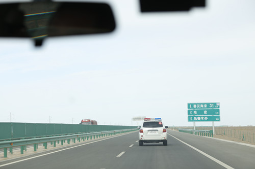 相較于國(guó)內(nèi)各大高速公路的車流如注,京新高速的車流量并不算大。馳騁在蒼茫天際間,一條宛如黑色緞帶般的路,從漫漫黃沙與荒蕪戈壁中蜿蜒伸向天邊,“天大地大,安全為大”的特色標(biāo)識(shí),一路相隨,目之所及,人跡、車輛鮮少,但一路震撼心靈的風(fēng)光絕不會(huì)讓你失望。
