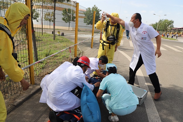 模擬事故發(fā)生在8月22日15時,慶華集團(tuán)精細(xì)化工2名巡檢員對芳烴罐區(qū)進(jìn)行例行檢查時,發(fā)現(xiàn)有芳烴泄露,因吸入過多芳烴氣體而相繼昏迷暈倒,而就在相鄰罐區(qū)還有10名操作工人正在作業(yè),隨后不久,儲罐區(qū)泄漏芳烴在靜電作用下引發(fā)火災(zāi),并且火勢很快蔓延至整個罐區(qū),由于事態(tài)嚴(yán)重,化工廠在迅速自救的同時即刻向119、110、120報警。在消防、醫(yī)護(hù)人員的救援救助中,火情得到了控制,人員得到了救助。