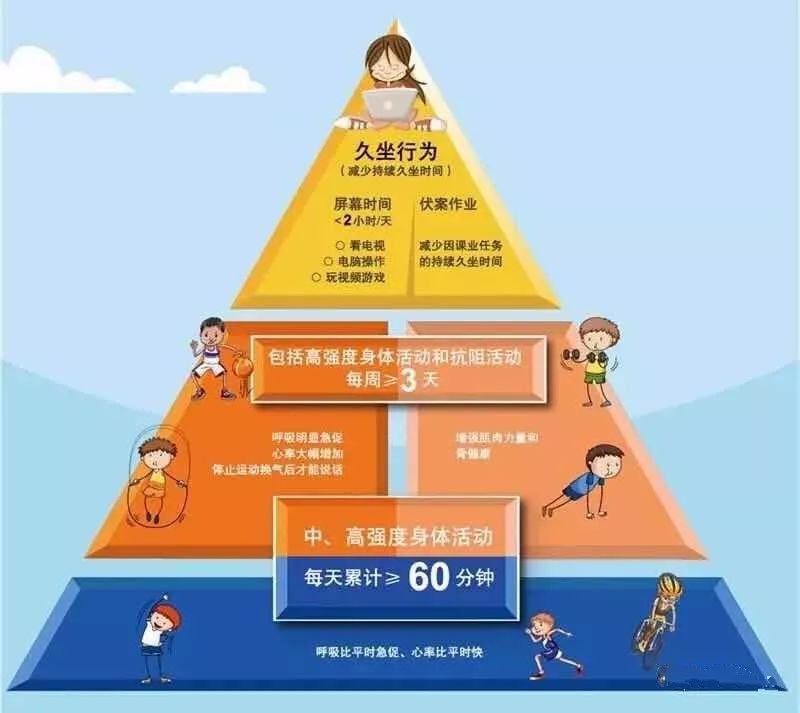 兒童和青少年每日應(yīng)至少累計(jì)60分鐘的中高強(qiáng)度身體活動(dòng),包括每周至少3天的高強(qiáng)度身體活動(dòng)和增強(qiáng)肌肉力量、骨骼健康的抗阻活動(dòng)。