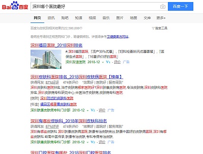 例如,在魏則西事件中備受輿論譴責(zé)的百度,兩年過去了,我現(xiàn)在在百度里搜索“深圳哪個醫(yī)院最好”,出來的結(jié)果不是“北大醫(yī)院”、“人民醫(yī)院”、“港大醫(yī)院”等,仍然是如下: