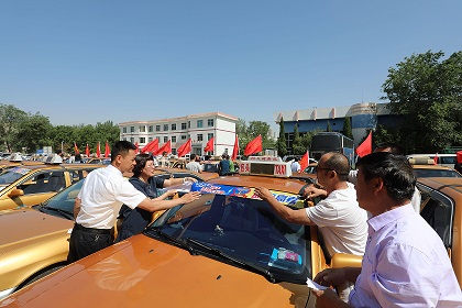 薩仁高娃為愛心出租車司機發(fā)放了礦泉水,為出租車張貼“建行攜手出租車行業(yè)助力高考”的宣傳標語。在高考期間,考生可憑準考證免費乘坐貼有標語的公益出租車,并免費領取建行提供的礦泉水?;顒蝇F(xiàn)場氣氛熱烈并取得圓滿成功,受到包頭市交通運輸管理處和廣大出租車司機、家長考生的一致認可與好評。