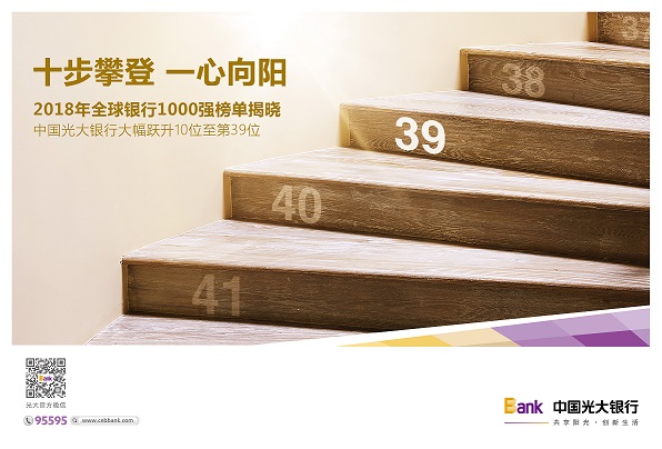 日前,英國《銀行家》雜志(The Banker)發(fā)布了“2018年全球銀行1000強”榜單,光大銀行排名較上年度大幅躍升十個位次,至第39位。
