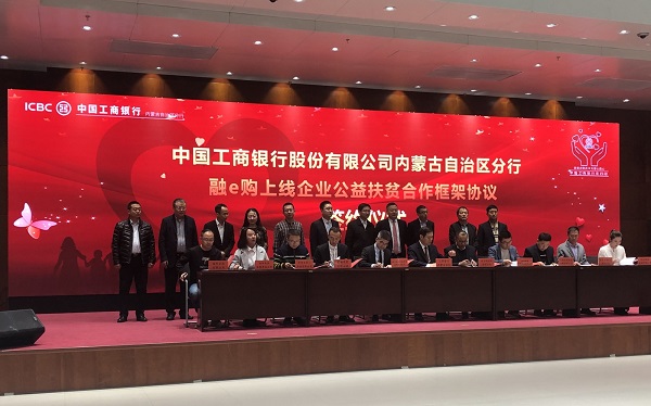 隨后,中國工商銀行內(nèi)蒙古分行涂曉光副行長與融e購10家商戶代表共同上臺,簽訂了《中國工商銀行與融e購上線企業(yè)扶貧幫扶合作框架協(xié)議》,與融e購優(yōu)質(zhì)企業(yè)共同為扶貧濟(jì)困助力。