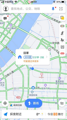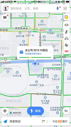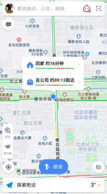 用戶打開最新版高德地圖,只要點擊屏幕正中央的懸浮氣泡就能進入到通勤地圖。用戶設置家和公司的地址后,上午上班時間,在家附近打開高德地圖,就會看到“去公司”通勤方案,下午下班時間,在單位附近打開高德地圖,就會看到“回家”通勤方案,如果用戶在家和公司之外的地點,打開高德地圖就會看到“去公司”和“回家”兩種通勤方案可供選擇。