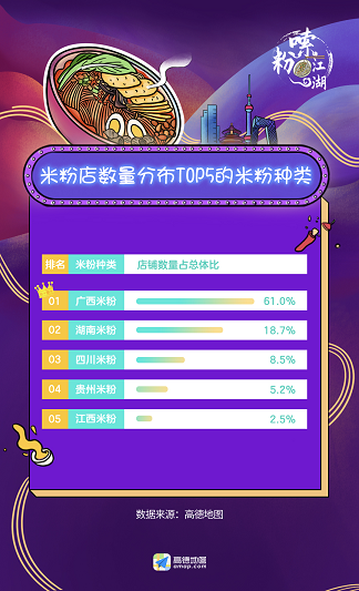 根據(jù)我國不同類別米粉店的分布,高德地圖大數(shù)據(jù)得出了“中國米粉滲透力排行”。數(shù)據(jù)顯示,全國粉店類別中,廣西米粉分布最廣,占比高達61%,其后依次是湖南米粉、四川米粉、貴州米粉、江西米粉。另外,廣西米粉雖然分布較廣,但在天津、云南、重慶分布較少;湖南米粉在廣東、湖北、河南覆蓋相對較高;四川米粉大都在四川省內(nèi);貴州米粉在四川分布也較多;江西米粉在廣州和福建分布