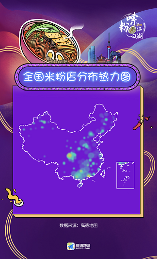 目前,已形成了廣西米粉、湖南米粉、貴州米粉、江西米粉、新疆米粉、海南米粉等地方特色米粉。誰才是天下第一粉?這個話題一直眾說紛紜,沒有定論。為此,高德地圖大數(shù)據(jù)挖掘了我國粉店的分布和熱度情況,推出了“嗦粉地圖”。