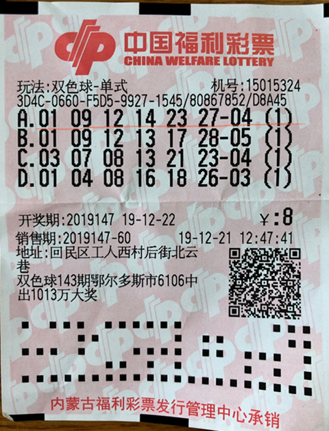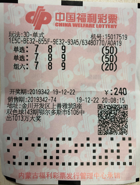 ? ? ?12月22日,3D游戲第2019342期、雙色球游戲第2019147期開獎,來自呼和浩特市金川開發(fā)區(qū)上善雅筑B座的第15017519號和回民區(qū)工人西村后街北云巷的第15015324福彩銷售站各自中出一注3D大獎和一注雙色球二等獎,獎金分別為107460元和208693元!
