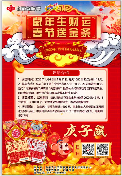 為更好地回饋彩民朋友,內(nèi)蒙福彩中心于2020年1月4日至1月21日開展“鼠年生財運,春節(jié)送金條”促銷活動。