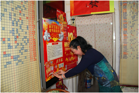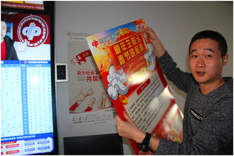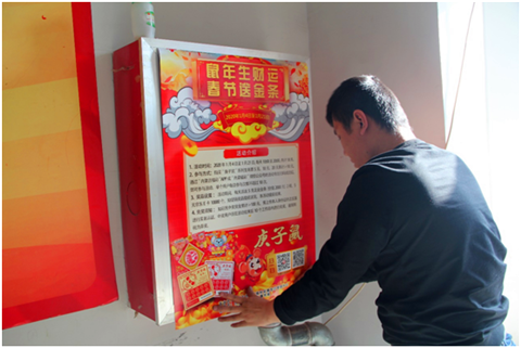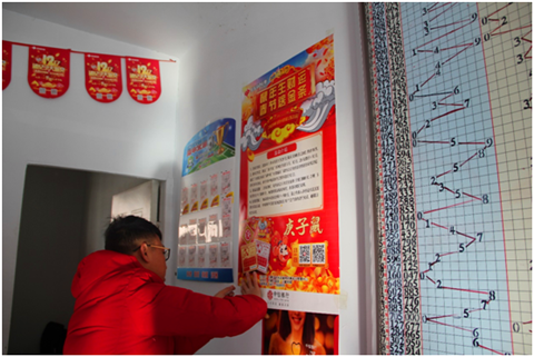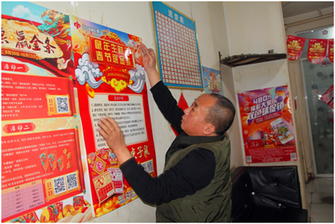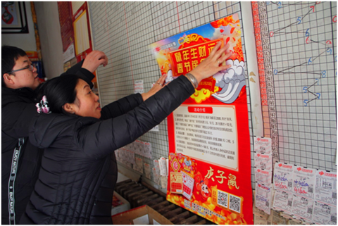 工作人員協(xié)助銷售站業(yè)主張貼海報,為業(yè)主與銷售站內(nèi)的彩民詳細(xì)講解新彩票玩法與活動規(guī)則,幫助他們關(guān)注微信公眾號和下載APP,由于活動期間每日有2根5g足金金條、萬張京東卡送出,故提醒業(yè)主與彩民朋友及時查詢,切勿忽略中獎信息。