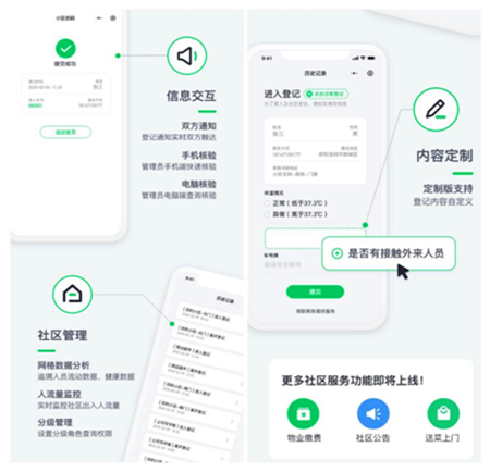 “銀商小區(qū)優(yōu)碼”可杜絕紙筆登記造成交叉感染,同時(shí)具有保證人員信息安全,后臺(tái)數(shù)據(jù)(脫敏處理)可長(zhǎng)期保存、方便查詢,數(shù)據(jù)及時(shí)匯總,查詢疑似病例活動(dòng)軌跡等多方面優(yōu)勢(shì)。并可配套提供社區(qū)公告、物業(yè)便民服務(wù)、物資配送上門(mén)等服務(wù)。