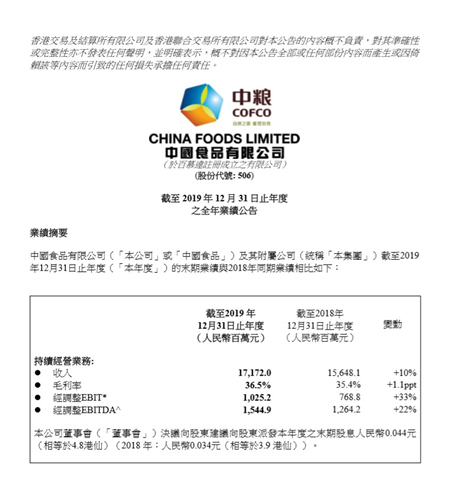 3月24日,中糧可口可樂(lè)大股東中國(guó)食品有限公司(下稱(chēng)“中國(guó)食品”或“公司”,股票代碼:00506.HK)發(fā)布截至2019年12月31日的全年業(yè)績(jī)報(bào)告。報(bào)告期內(nèi),中國(guó)食品銷(xiāo)售總額171.72億元(單位:人民幣,下同),同比增長(zhǎng)9.7%,超額完成業(yè)績(jī)目標(biāo),凈利潤(rùn)同比勁增30.2%至4.18億元,毛利率同比提升1.1個(gè)百分點(diǎn)至36.5%。