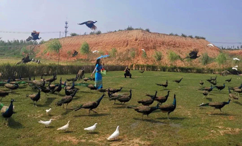 在榆林鎮(zhèn)孔雀聚義山莊,綠蔭下散養(yǎng)雞、鴕鳥在籠中悠然踱步,通道上七彩風(fēng)車迎風(fēng)飛轉(zhuǎn),自然質(zhì)樸的鄉(xiāng)村風(fēng)貌中體現(xiàn)著濃濃的現(xiàn)代氣息。