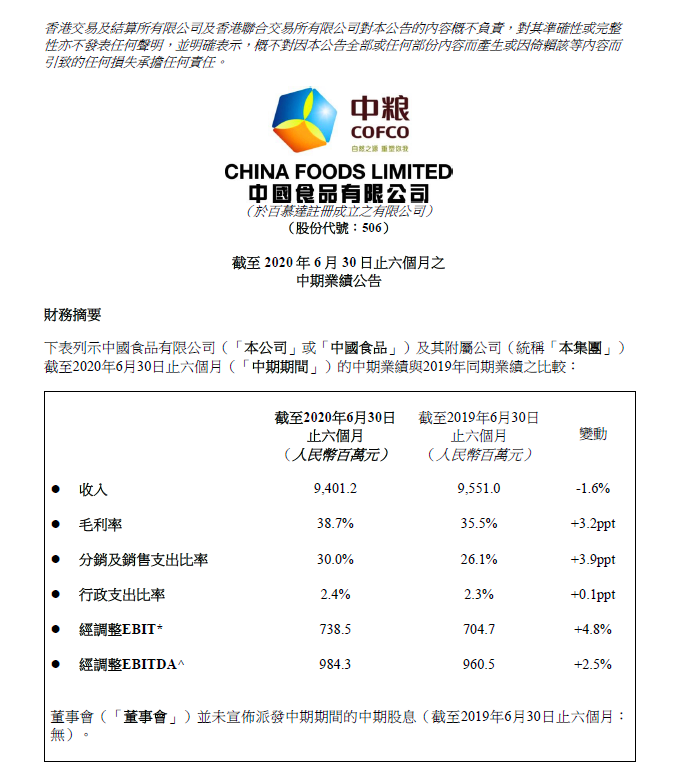 日前,中糧可口可樂大股東中國(guó)食品有限公司(股票代碼:00506.HK,以下簡(jiǎn)稱中國(guó)食品)發(fā)布了2020年中期業(yè)績(jī)報(bào)告。期內(nèi),公司銷售收入達(dá)94.01億元人民幣,得益于有效的成本控制和財(cái)務(wù)費(fèi)用的下降,中國(guó)食品凈利潤(rùn)增厚至5.6億人民幣,同比增幅5%。