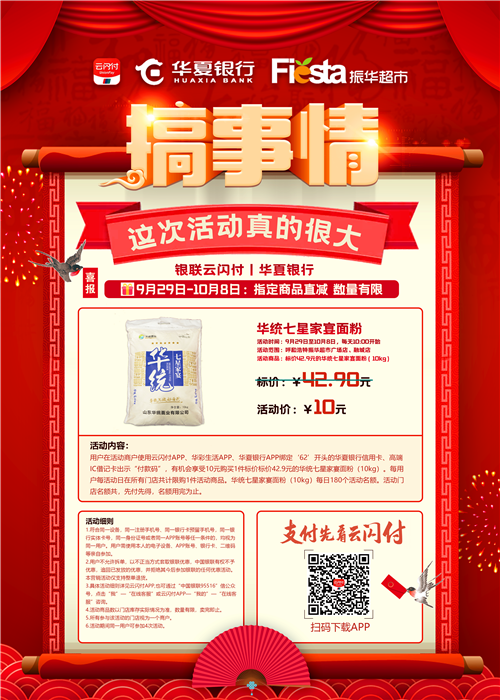 9月29日至10月8日,每天10:00開始活動范圍:呼和浩特振華超市廣場店、融城店活動商品:標(biāo)價42.9元的華統(tǒng)七星家宴面粉(10kg)活動內(nèi)容:用戶在活動商戶使用云閃付APP、華彩生活A(yù)PP、華夏銀行APP出示“付款碼”支付,有機(jī)會享受10元購買1件標(biāo)價標(biāo)價42.9元的華統(tǒng)七星家宴面粉(10kg)。每用戶每活動日在所有門店共計(jì)限購1件活動商品。華統(tǒng)七星家宴面粉(10kg)每日180個活動名額?;顒娱T店名額共享,先付先得,名額用完為止。