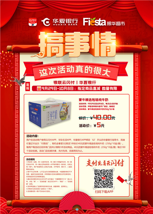 9月29日至10月8日,每天10:00開始活動范圍:呼和浩特振華超市廣場店、融城店活動商品:標(biāo)價40的蒙牛精選牧場純牛奶(250g*10盒/提)活動內(nèi)容:用戶在活動商戶使用云閃付APP、華彩生活A(yù)PP、華夏銀行APP出示“付款碼”支付,有機(jī)會享受5元購買1件標(biāo)價40元的蒙牛精選牧場純牛奶(250g*10盒/提)。每用戶每活動日在所有門店共計(jì)限購1件活動商品。40元的蒙牛精選牧場純牛奶(250g*10盒/提)每日180個活動名額?;顒娱T店名額共享,先付先得,名額用完為止。