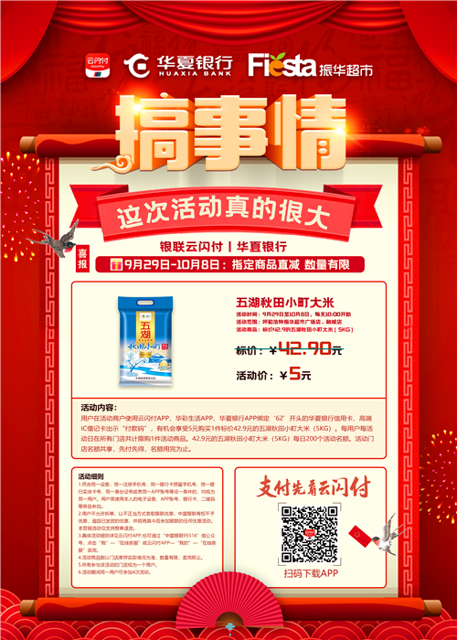 9月29日至10月8日,每天10:00開始活動范圍:呼和浩特振華超市廣場店、融城店活動商品:標(biāo)價42.9的五湖秋田小町大米(5KG)活動內(nèi)容:用戶在活動商戶使用云閃付APP、華彩生活A(yù)PP、華夏銀行APP出示“付款碼”支付,有機(jī)會享受5元購買1件標(biāo)價42.9元的五湖秋田小町大米(5KG)。每用戶每活動日在所有門店共計(jì)限購1件活動商品。42.9元的五湖秋田小町大米(5KG)每日200個活動名額?;顒娱T店名額共享,先付先得,名額用完為止。