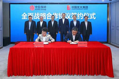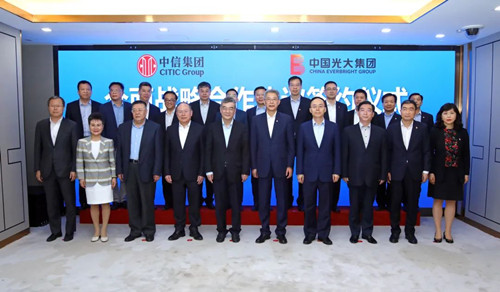 光大集團董事長李曉鵬、總經(jīng)理吳利軍、監(jiān)事長朱洪波,中信集團董事長朱鶴新、總經(jīng)理奚國華、監(jiān)事長任生俊等見證簽約。光大集團執(zhí)行董事付萬軍、中信集團副總經(jīng)理李慶萍代表雙方簽約。