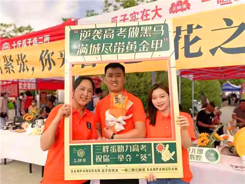 天氣炎熱,三胖蛋貼心準備了抽紙、冷飲、礦泉水、瀉火藥、藿香正氣水、花露水、創(chuàng)可貼等應(yīng)急藥品,三胖蛋瓜子吉祥物全天候在現(xiàn)場為考生及家長提供服務(wù),帳篷內(nèi)用向日葵、彩燈等物品,對服務(wù)區(qū)進行點綴寓意考生“一舉奪魁”、“前程似錦”,步入考場前,有三胖蛋為考生加油打氣,祝愿高考千金一“嗑”,穩(wěn)定發(fā)揮,走出考場后,有三胖蛋為考生贈送雪糕,祝你此行一舉奪“葵”,“糕”中狀元。