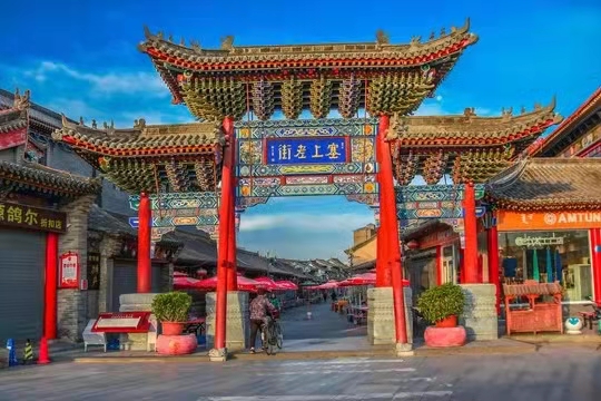 從東入口踏上古韻猶存的塞上老街,會看到老街東端豎立著一座醒目的牌樓,正面書寫著古色古香的“塞上老街”四個大字。