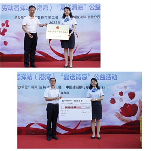 日前,呼和浩特市總工會(huì)與建行呼和浩特分行在賽罕區(qū)支行聯(lián)合舉辦“勞動(dòng)者港灣”夏送清涼公益活動(dòng),同時(shí)為賽罕區(qū)支行“最美工會(huì)戶外勞動(dòng)者服務(wù)站點(diǎn)”進(jìn)行授牌。