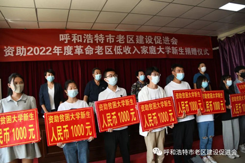 此次捐贈(zèng)儀式由呼和浩特市老區(qū)建設(shè)促進(jìn)會(huì)出資104000元,共資助104名低收入家庭大學(xué)新生,每人資助1000元。