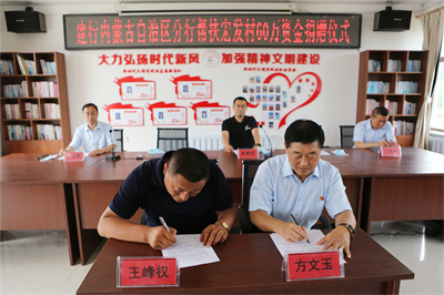 區(qū)分行辦公室副主任(兼駐宏發(fā)村第一書記)方文玉代表建行內(nèi)蒙古區(qū)分行向宏發(fā)村捐贈鄉(xiāng)村振興幫扶資金。區(qū)分行捐贈60萬幫扶資金,用于建設(shè)宏發(fā)村文化廣場和購買環(huán)境整治機具設(shè)備。項目建成后,將極大地豐富村民的精神文化生活,有力改善宏發(fā)村人居衛(wèi)生環(huán)境,促進鞏固脫貧攻堅成果與鄉(xiāng)村振興有效銜接。