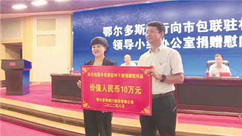鄂爾多斯銀行黨委向市包聯(lián)駐村辦包聯(lián)駐村干部捐贈(zèng)價(jià)值10萬元“金融助力包聯(lián)駐村”工作慰問品。