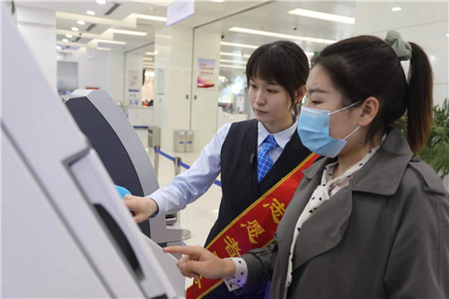 建設銀行包頭分行推進數(shù)字化經(jīng)營建設智慧政務平臺,圖為營業(yè)室員工指導市民查詢社保信息。(攝影:董凱)