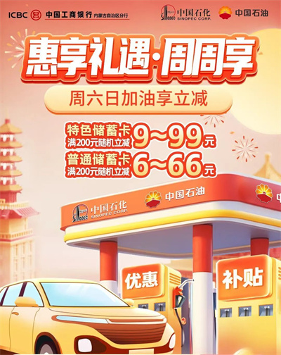 3.普通卡:實(shí)際支付滿200元隨機(jī)立減6-66元優(yōu)惠,每人每周在中國石油、中國石化各有機(jī)會參加一次活動。內(nèi)蒙工行非特色儲蓄卡均可參與。