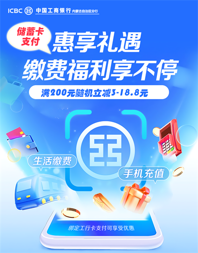 活動期間,客戶通過支付寶APP首頁-手機(jī)充值、生活繳費(fèi)場景消費(fèi),綁定內(nèi)蒙工商銀行儲蓄卡支付可享受滿200元隨機(jī)立減3-18.8元。名額有限、先到先得,同一客戶活動期內(nèi)有機(jī)會參加1次(同一支付寶賬號、手機(jī)號、身份證號、手機(jī)終端、銀行卡號,符合以上任一條件均視為同一客戶)。