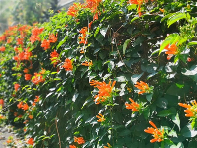 墻面綠化是炮仗花的主要應用形式,常利用圍墻、建筑外墻、擋土墻等進行種植,達到增加城市綠化率的目的,既發(fā)揮了墻面綠化占地面積小、綠化量大的優(yōu)點,也為炮仗花提供了較為適宜的生長環(huán)境。此外,屋頂綠化、門庭、棚架、橋梁、坡面、巖石和假山栽培等,也是其常見的應用形式。