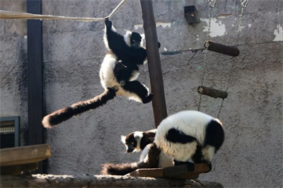 領狐猴的皮毛和熊貓一樣分為黑白兩色,雄性和雌性的外表相同。它們全身黑色,四肢、頭部和背部有白色區(qū)域,頸部有鬃毛,黑色的吻部相對突出,尾與身等長,眼珠呈桔紅色,頭黑,耳朵帶白色簇毛,毛茸茸的尾巴通常也是黑色。腿比臂長得多,用四肢行走。