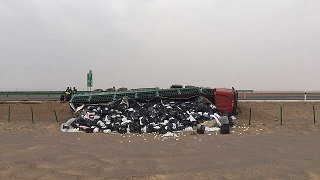 2018年4月19日,來自遼寧省葫蘆島市的周寶鋼,從新疆地區(qū)拉著滿滿一車庫爾勒香梨駕車回家途中,由于疲勞駕駛,在阿左旗京新高速蘇宏圖路段1132公里處發(fā)生車輛側(cè)翻,一半掛牽引車的香梨傾車而出,散落在高速公路上。“前不著村,后不著店”、電話處于盲區(qū),周寶鋼看到滿車損失的香梨不知所措。