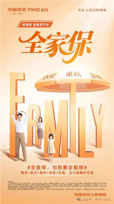 ①全家保保險(xiǎn)產(chǎn)品計(jì)劃,簡稱全家保,包括平安安佑福(惠享版)定期重大疾病保險(xiǎn)(主險(xiǎn),簡稱安佑惠享定期)、平安附加e生保(尊享版)長期醫(yī)療保險(xiǎn)(費(fèi)率可調(diào))(簡稱e生保尊享版)或平安附加e生保(保證續(xù)保版)醫(yī)療保險(xiǎn)(簡稱e生保續(xù)保版)、平安附加優(yōu)享住院費(fèi)用醫(yī)療保險(xiǎn)(簡稱優(yōu)享醫(yī)療)、平安附加意外傷害醫(yī)療保險(xiǎn)(B)(簡稱意外醫(yī)療B )、平安附加(2026)意外傷害保險(xiǎn)(簡稱附加意外26)、平安附加(2026)定期壽險(xiǎn)(簡稱附加定壽26)、平安附加少兒(2021)定期壽險(xiǎn)(簡稱少兒定壽21)、平安附加(2026)失能收入損失保險(xiǎn)(簡稱附加失能26)。您可根據(jù)實(shí)際保障需求與經(jīng)濟(jì)承受能力合理規(guī)劃保險(xiǎn)產(chǎn)品計(jì)劃。本保險(xiǎn)產(chǎn)品計(jì)劃中的附加險(xiǎn)均為可選,如附加險(xiǎn)均不符合需求,您也可以單獨(dú)購買本保險(xiǎn)產(chǎn)品計(jì)劃中的主險(xiǎn)。若單獨(dú)投保主險(xiǎn),責(zé)任詳見條款。②本文所稱重疾指安佑惠享定期合同約定的120種重疾,等待期90天。發(fā)生合同條款約定的重疾按100%基本保險(xiǎn)金額給付重疾保險(xiǎn)金。重疾保險(xiǎn)金限給付1次,給付后身故金不再給付。③百萬醫(yī)療保障由e生保尊享版提供。具體責(zé)任詳見條款。保額400萬指e生保住院醫(yī)療保障最高400萬。④住院費(fèi)用保險(xiǎn)金由優(yōu)享醫(yī)療提供。給付被保險(xiǎn)人因意外傷害或30天等待期后因疾病經(jīng)醫(yī)院診斷必須住院治療的,符合條款約定的住院醫(yī)療費(fèi)用。本附加險(xiǎn)的年度給付限額為1萬元。具體責(zé)任詳見條款。⑤家庭(2人及以上)投保全家保保險(xiǎn)產(chǎn)品計(jì)劃情況下,起保點(diǎn)為800元/人/年。其中每人具體保費(fèi)受產(chǎn)品組合、保額、年齡、性別、交費(fèi)期等因素影響,以實(shí)際投保為準(zhǔn)。⑥本文所載內(nèi)容僅供您理解保險(xiǎn)條款所用,在某些情形下,我們不承擔(dān)給付保險(xiǎn)金的責(zé)任。具體保險(xiǎn)責(zé)任、責(zé)任免除、合同解除及其他內(nèi)容詳見保險(xiǎn)條款。