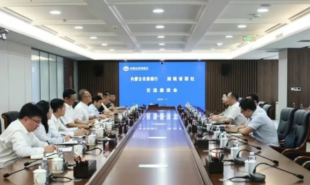 7月9日,湖南省農(nóng)村信用社聯(lián)合社黨委書記、理事長黃向陽一行來內(nèi)蒙古農(nóng)商銀行座談交流,黨委書記、董事長劉豐出席。