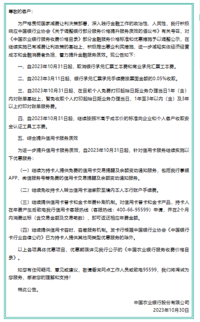 11月13日,中國銀行發(fā)布公告,再次對信用卡服務(wù)進(jìn)行減費(fèi)讓利,其中包括轉(zhuǎn)賬轉(zhuǎn)出手續(xù)費(fèi)、信用卡換卡、補(bǔ)發(fā)卡手續(xù)費(fèi)等多項(xiàng)費(fèi)用的限時(shí)減免。