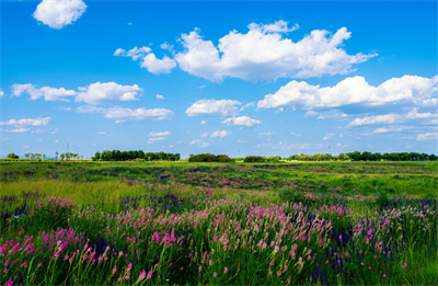 呼和浩特市玉泉區(qū)大黑河郊野公園觀光帶內,繽紛花海與藍天白云相映成趣,景美如畫。(攝影:丁根厚)