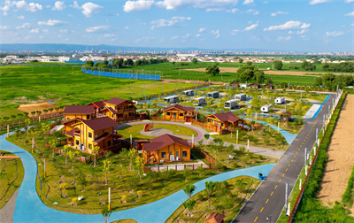 呼和浩特市玉泉區(qū)大黑河郊野公園“清嶼林夕房車營地”與朵朵白云相映成趣,構成一幅愜意的郊野畫卷。(攝影:丁根厚)